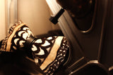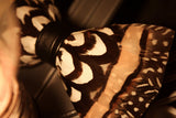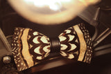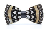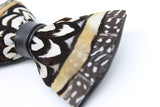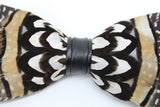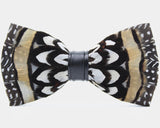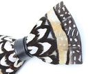This gorgeous feather bow tie is layered with three different bird feathers. The brown partridge plumage feather stands out beautifully like dragon scales from the other elegant black and white layers. The bow tie is as dazzling as a flaming dragon.
