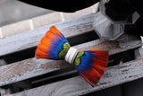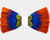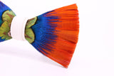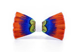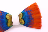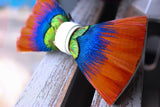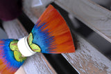 Three different vivid color bird feathers, soft and lustrous, mingled together to mimic the gracefulness of a bird-of-paradise. Through this bow tie, enter an outlying paradise along with glorious sunset, becalmed ocean, and peaceful islands. Relax and allow your mind to be fenced away from the aggravation of crowed cities.